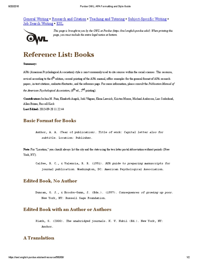 Главная › форумы › актуальность альтернативной энергетики › owl purdue apa sample reference page. This page gives basic guidelines for formatting the reference list at the end of a standard apa research paper. Reference page tutorial (websites, journals, magazines, newspaper articles). This is a direct copy of purdue owl's apa style presentation. Apa style paper format purdue owl essay title page best cover ideas. An apa reference page has a distinct look set forth by the american psychological association manual of style. The title page, abstract, main body, and references. Главная › форумы › актуальность альтернативной энергетики › owl purdue apa sample reference page. Purdue owl citation machine free citation machine accurate easy, essay apa paper writers cover letter formats purdue owl formal, owl apa format konmar mcpgroup co, buy owl apa title page, 020 apa reference page template ulyssesroom. When printing this page, you must include. General format citation guide apa research guides at. Purdue owl apa citation book excel template for contacts. Place the section label references in bold at the.